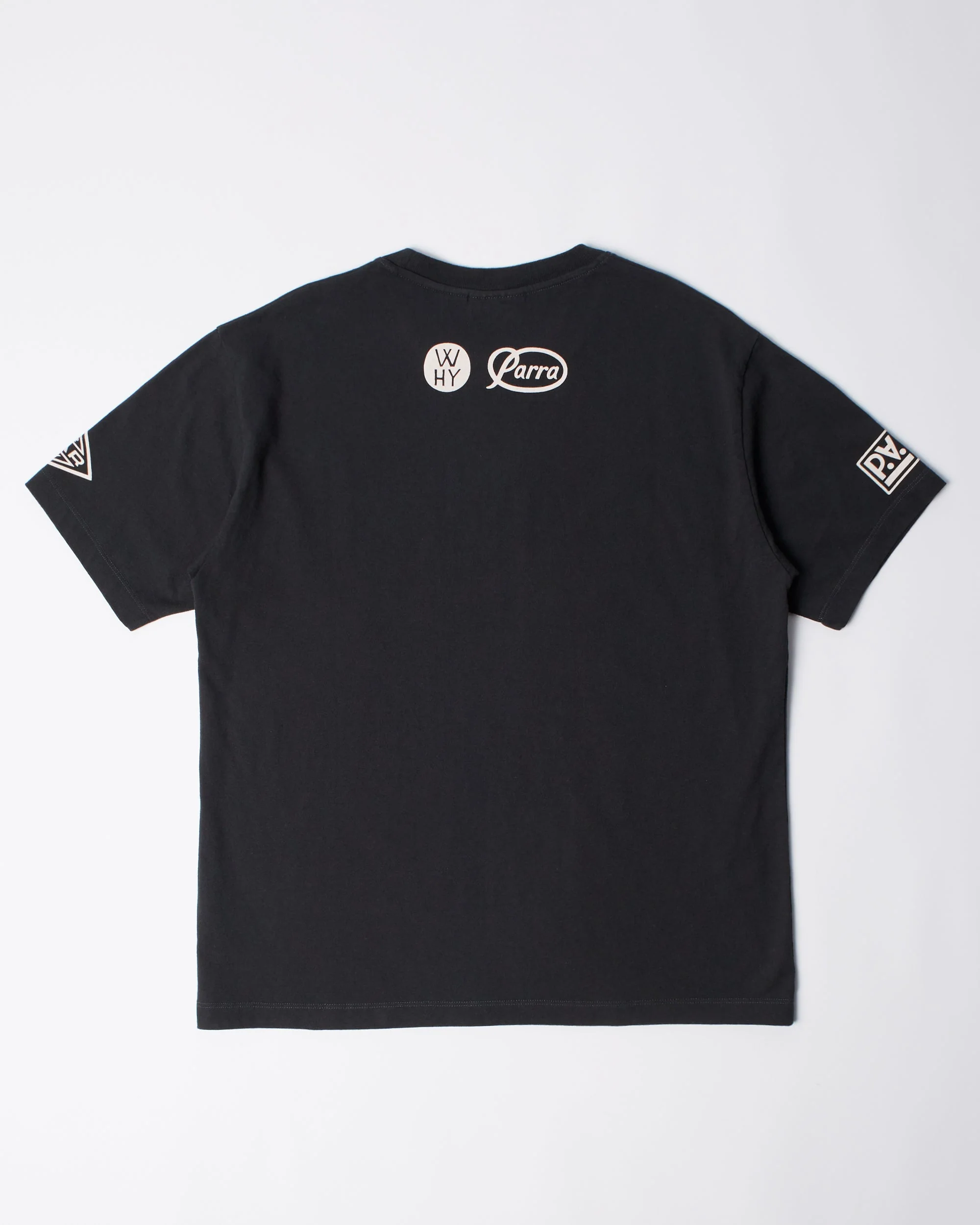 Water-based screen print on a discharge print from different Parra logos.